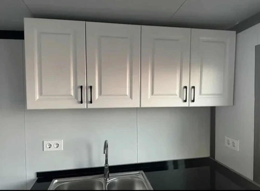 Cocina: equipada con armarios superiores y fregadero de acero inoxidable, diseñada para optimizar el espacio.