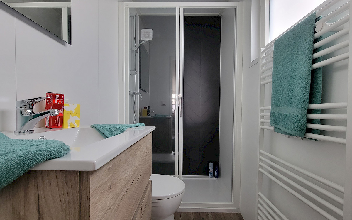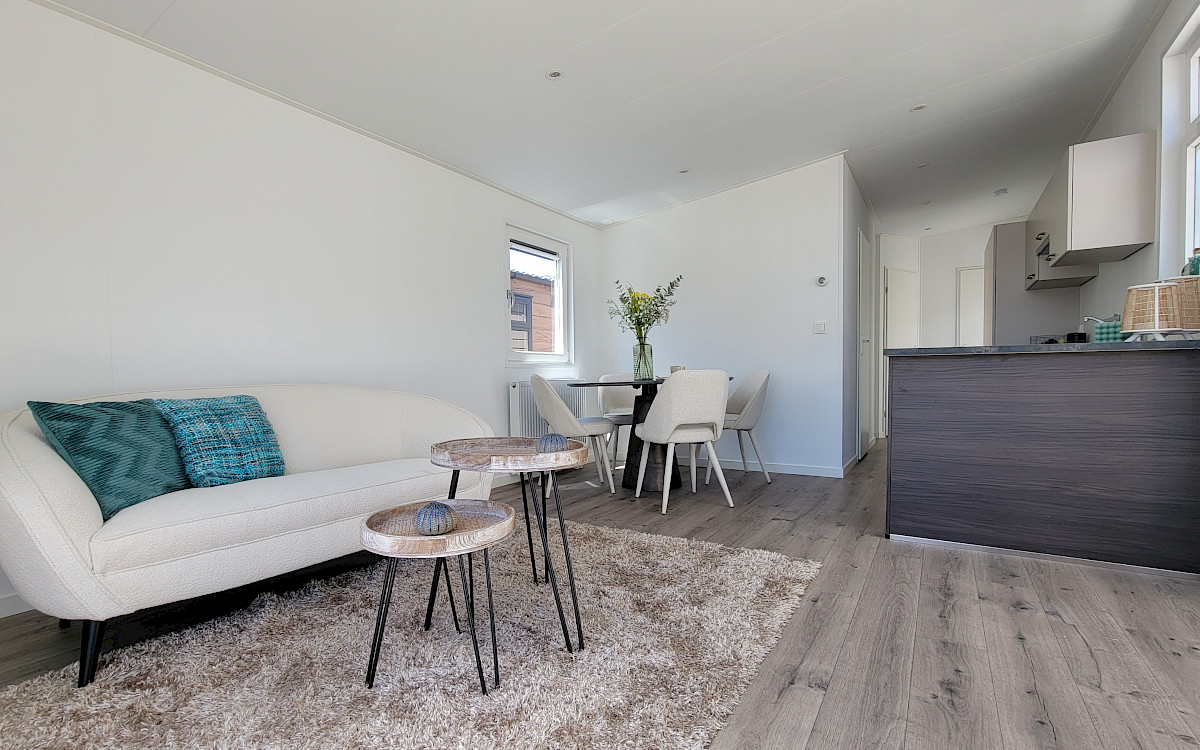 El Volente Deluxe ofrece todo lo necesario para una estancia confortable. El espacioso salón cuenta con suelo de vinilo, grandes puertas francesas y conexión para TV. La cocina en forma de L está totalmente equipada con amplio espacio de almacenamiento, placa de 4 fuegos, extractor de humos y frigorífico-congelador integrado. El dormitorio principal cuenta con una cama doble y un amplio armario con puertas correderas. El dormitorio de invitados/niños cuenta con dos camas individuales y prácticos armarios colgantes para mayor espacio de almacenamiento. El moderno baño cuenta con un elegante mueble de lavabo, un radiador de diseño, un inodoro y una amplia cabina de ducha con azulejos en las paredes. El chalet está equipado con revestimiento de plástico imitación madera, marcos de ventanas de plástico, doble acristalamiento y calefacción central: un equilibrio perfecto entre comodidad y durabilidad.