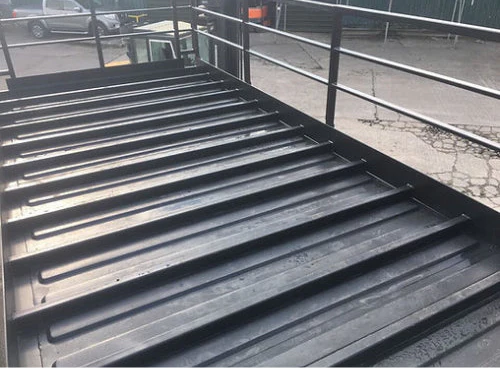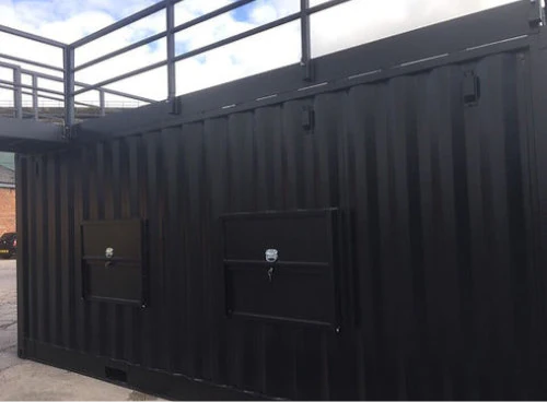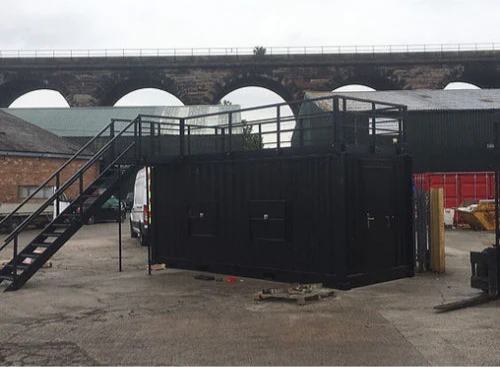 El exterior de acero negro mate aporta un aspecto industrial elegante, mientras que la terraza superior con escalera metálica y barandilla de seguridad crea un espacio extra ideal para un área lounge o una zona panorámica con vistas al evento.