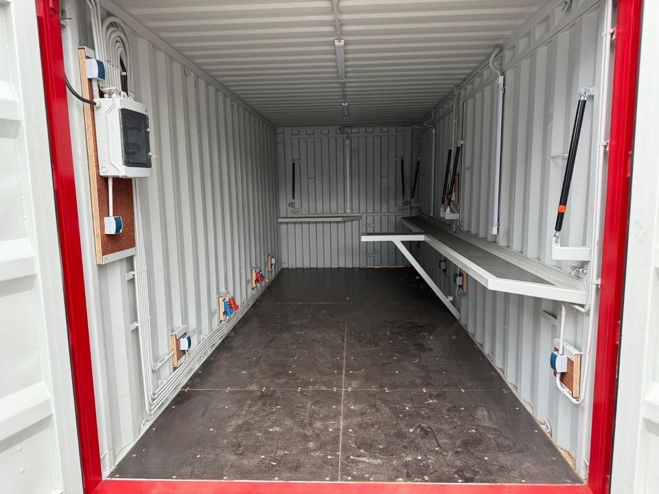 • La base es un contenedor marítimo nuevo y estable de 20 pies con cuatro barras en las puertas y una LockBox, en color rojo señal RAL3001