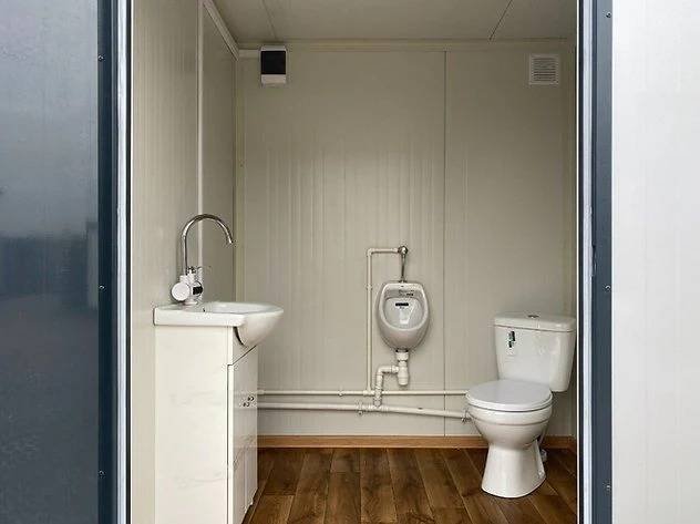 El módulo cuenta con dos cabinas WC independientes, además de un urinario, ofreciendo un servicio completo en un espacio reducido. Gracias a su aislamiento de 80 mm en perfil sándwich, proporciona una excelente protección térmica y reduce la pérdida de energía, asegurando un ambiente confortable en cualquier clima.