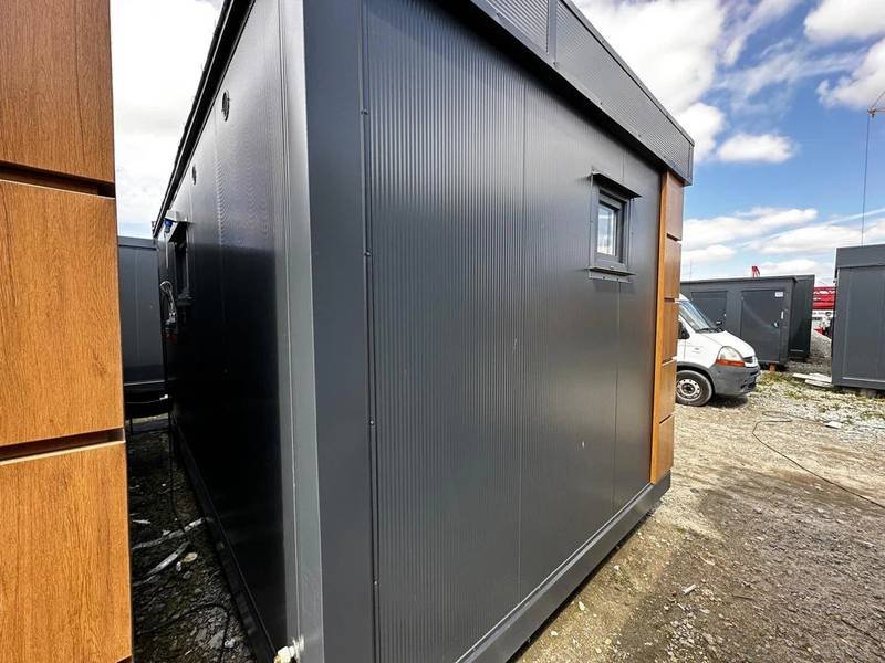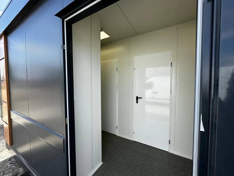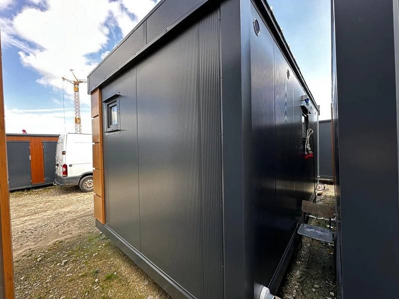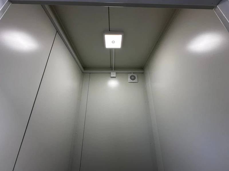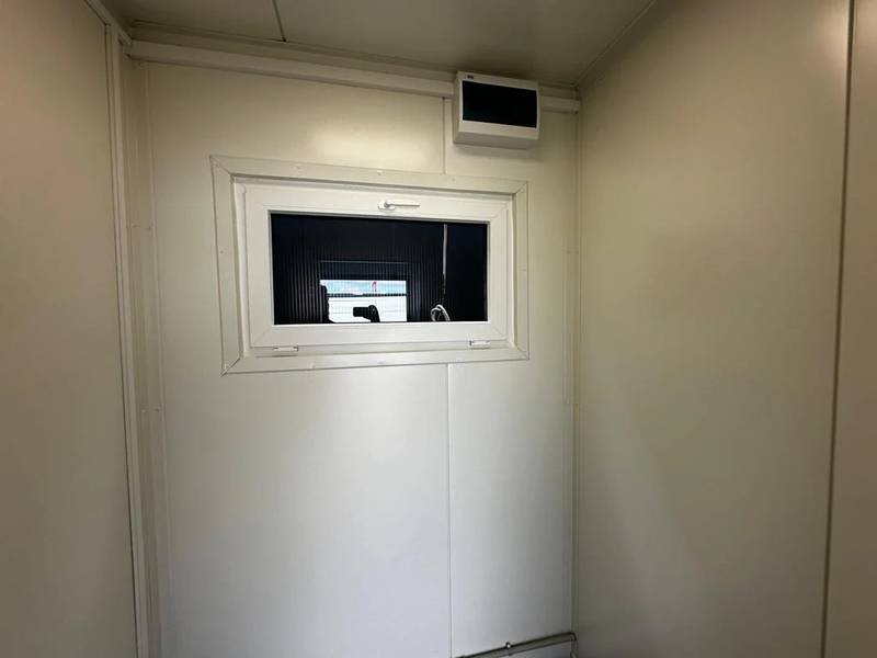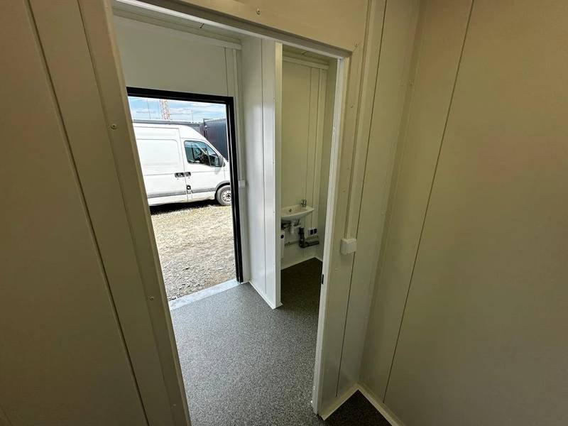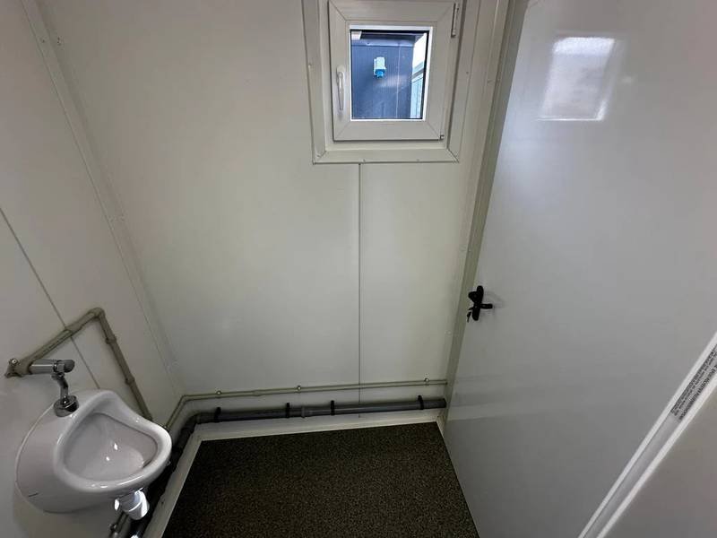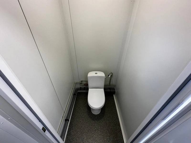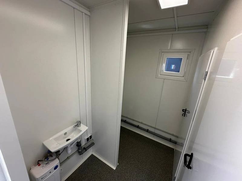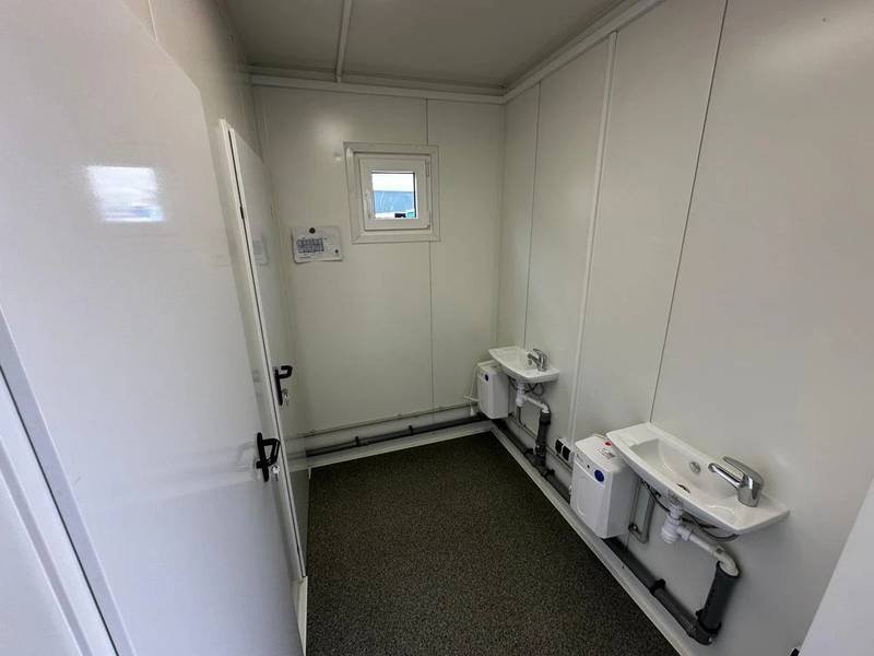 El módulo está equipado con 4 inodoros, 1 urinario y 3 lavabos, lo que permite un uso simultáneo para múltiples personas. Cuenta con una puerta en la pared corta y dos ventanas con persianas enrollables para una buena ventilación y luminosidad. La instalación eléctrica está completa y ofrece varias opciones adicionales como ducha, caldera y aire acondicionado (split) para adaptar el contenedor a tus necesidades específicas.