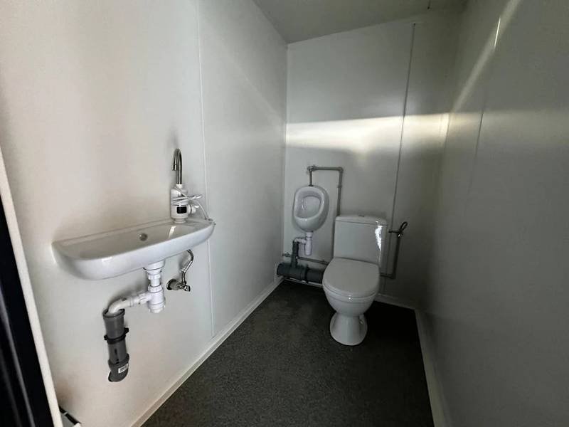 Este contenedor sanitario doble es una solución eficiente para cualquier lugar que necesite instalaciones de baño móviles. Su diseño compacto y funcional, con dos cabinas independientes, lo hace perfecto para obras, eventos o áreas de descanso.